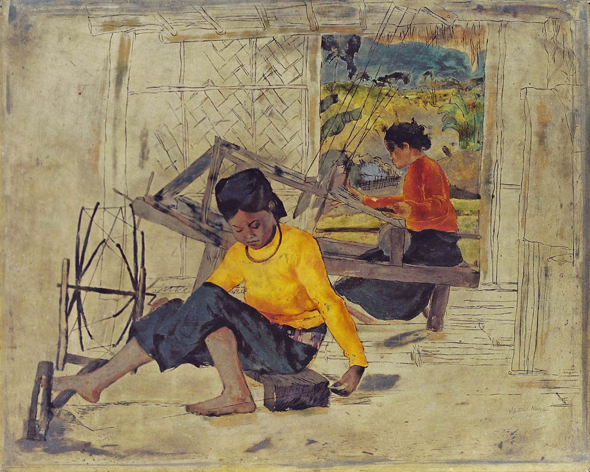 Dệt cửi quay tơ (1957), Sơn mài, 55.8 x 70 cm, Nguyễn Đức Nùng