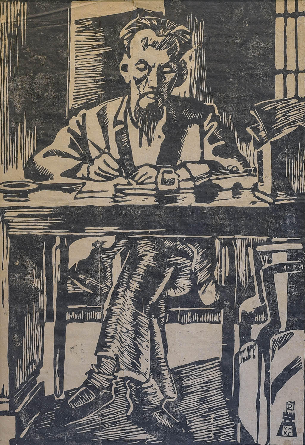 Hồ Chủ tịch làm việc ở Bắc Bộ phủ (1946), Khắc gỗ, 59.5 x 41.5 cm, Tô Ngọc Vân