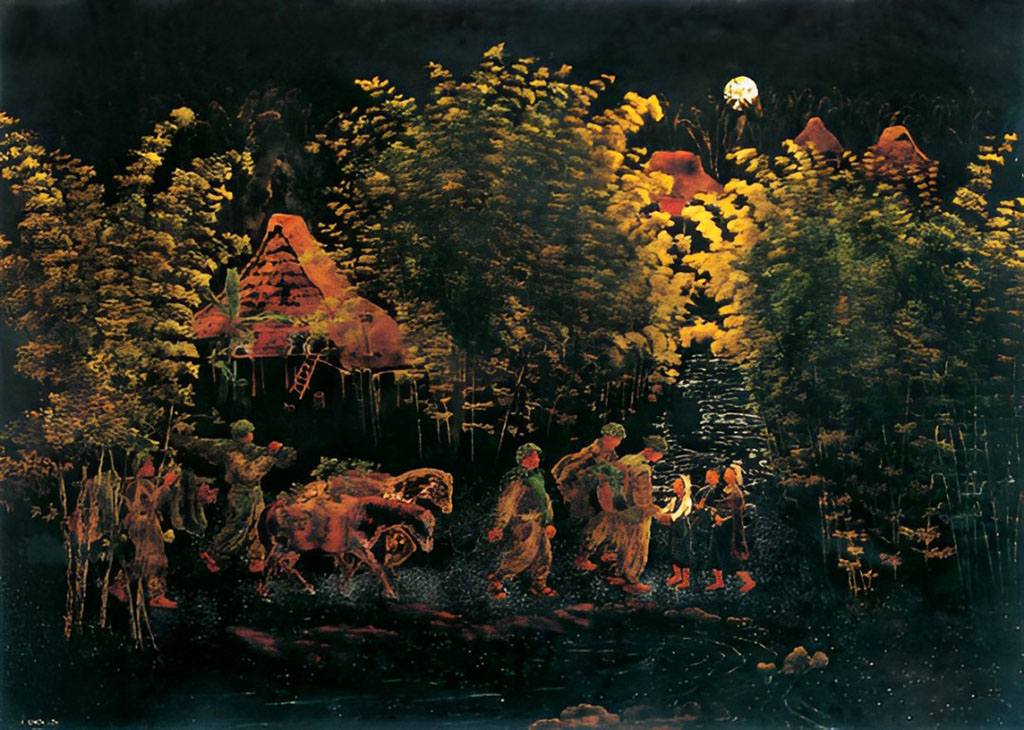 Ảnh hưởng của văn hóa dân gian và nghệ thuật truyền thống Việt Nam được thể hiện rõ ràng qua cách họa sĩ sử dụng màu sắc và hình khối, tạo nên một không gian vừa gần gũi vừa lãng mạn. Bức tranh như một lời ghi chép sống động về những giá trị tinh thần của dân tộc trong giai đoạn khó khăn, khơi gợi lòng tự hào và ý thức trách nhiệm đối với quê hương.